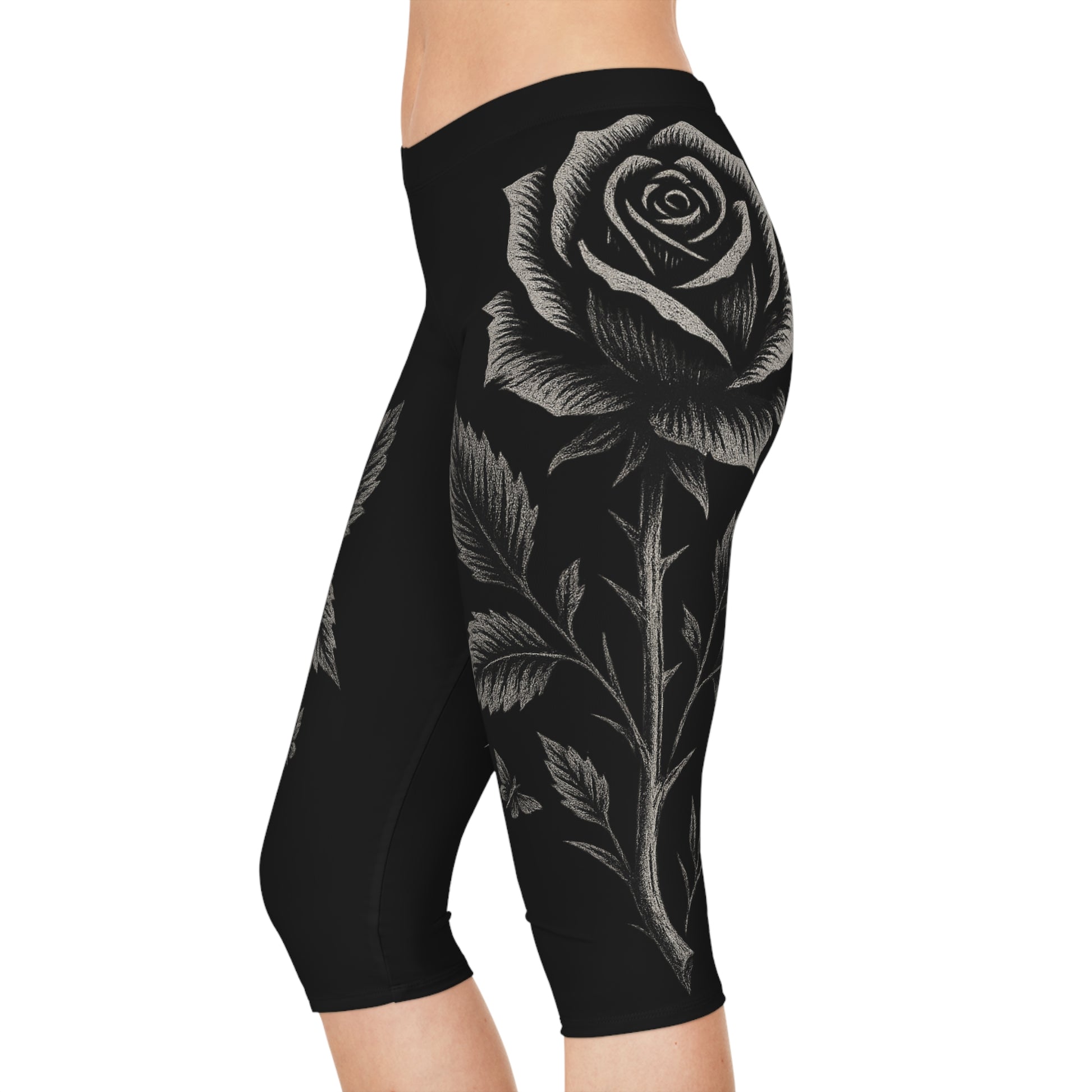 These black rose capri leggings lean into dark aesthetic and gothic fashion with a clean, art-driven design that feels intentional and visually balanced on the body.