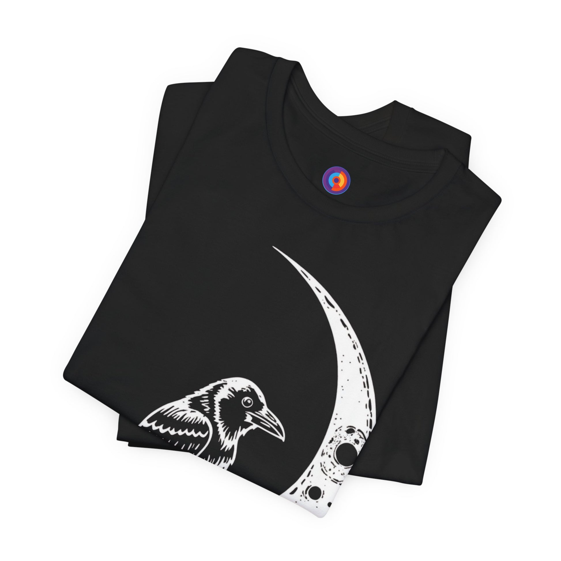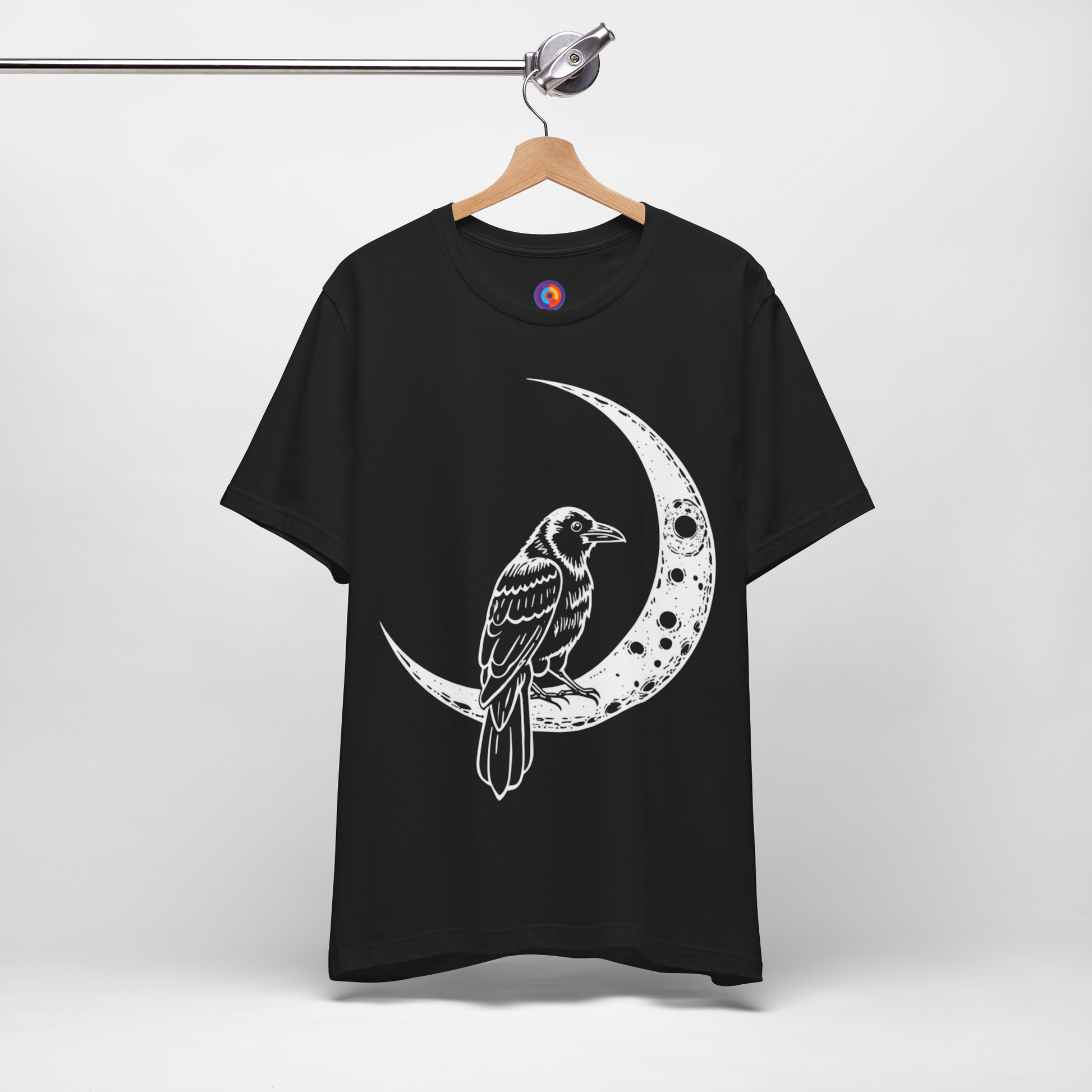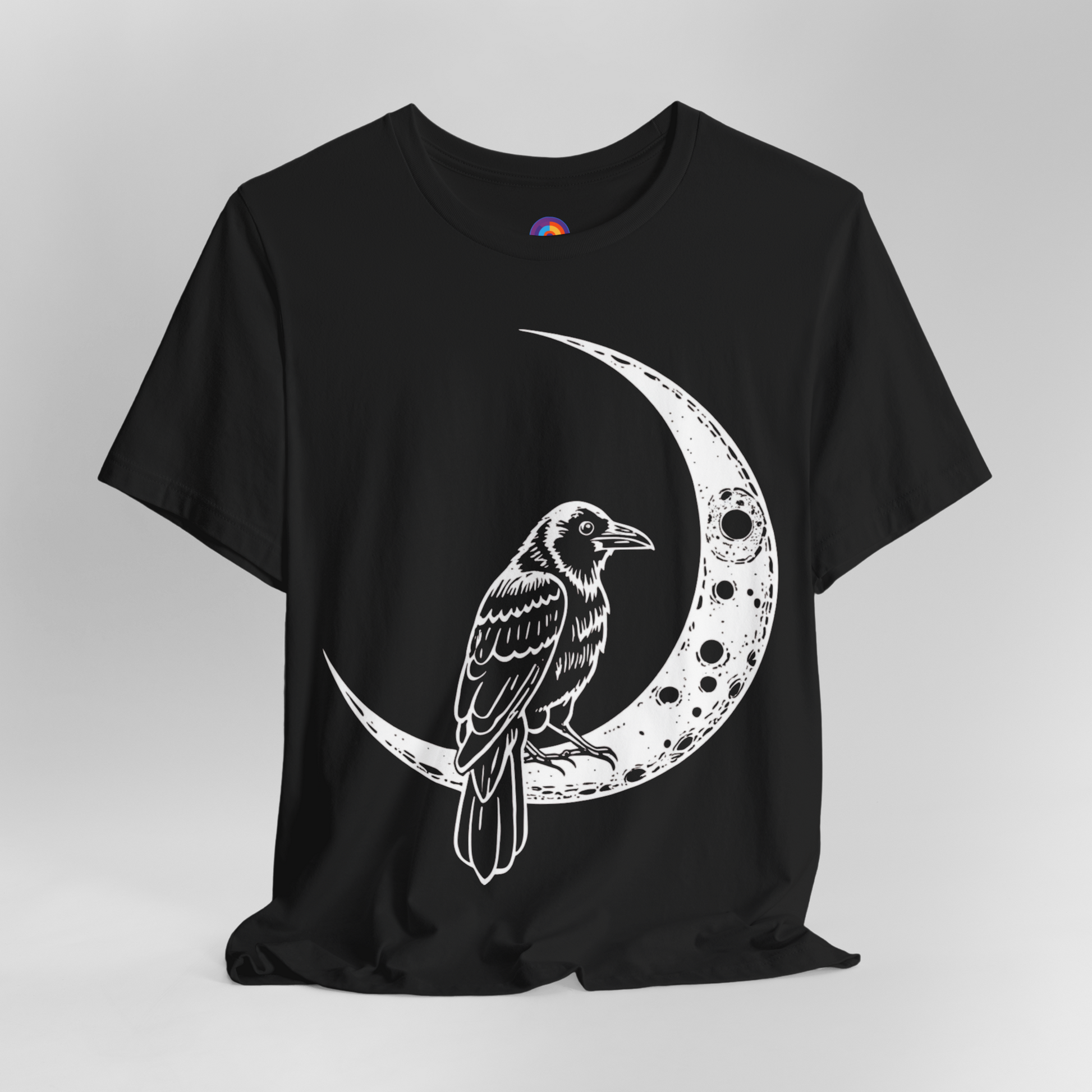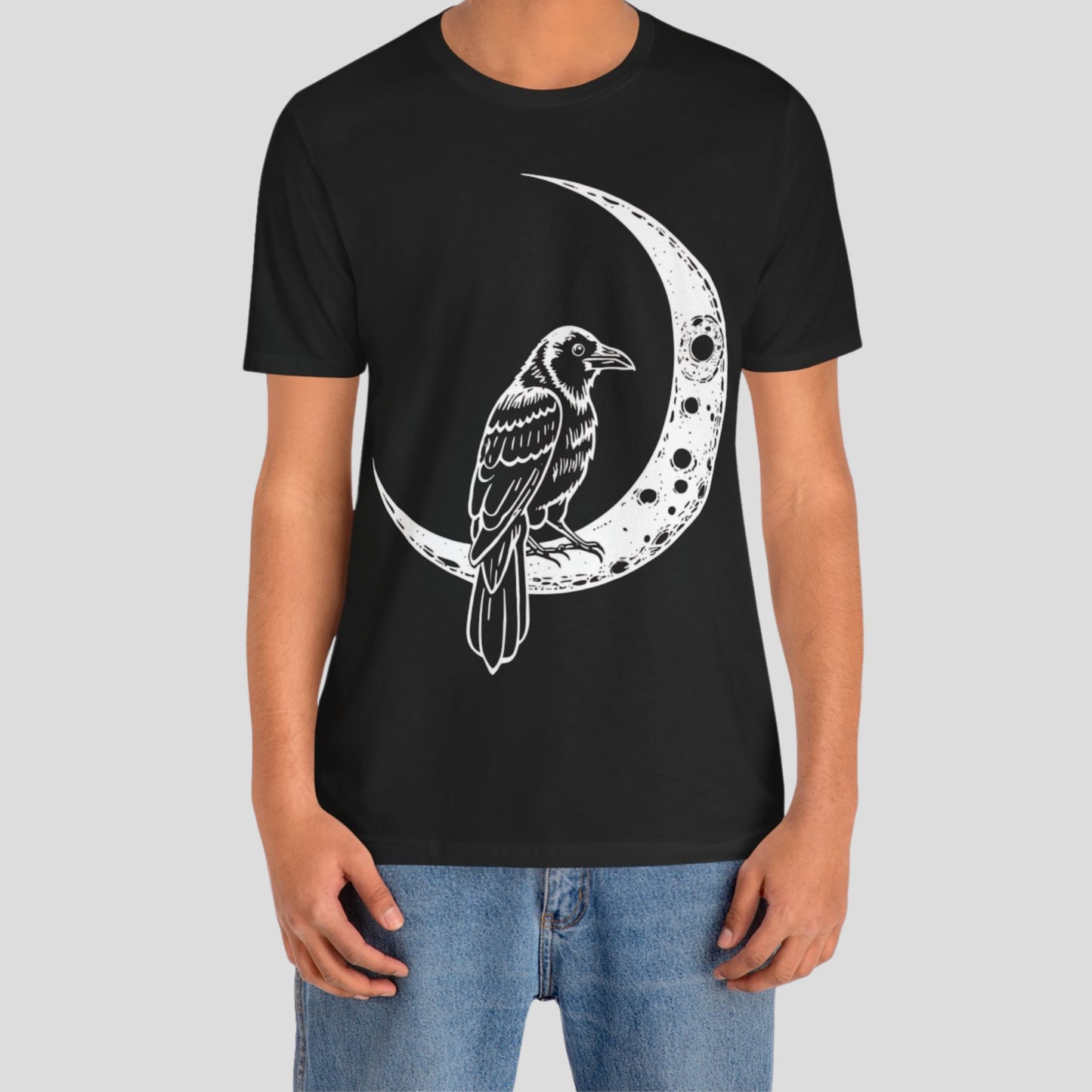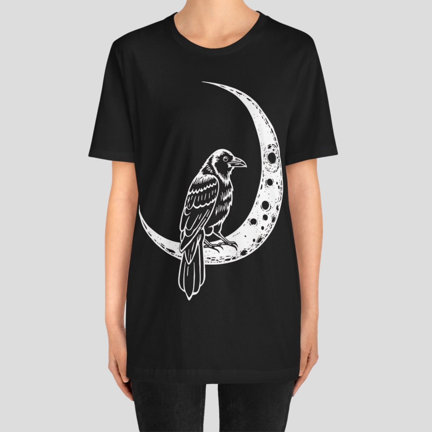Our Crow on Crescent Moon T-Shirt features a black and white illustration of a lone crow perched on a crescent moon. The image is quiet, still, and slightly surreal-open to interpretation but visually grounded in dark, symbolic imagery.