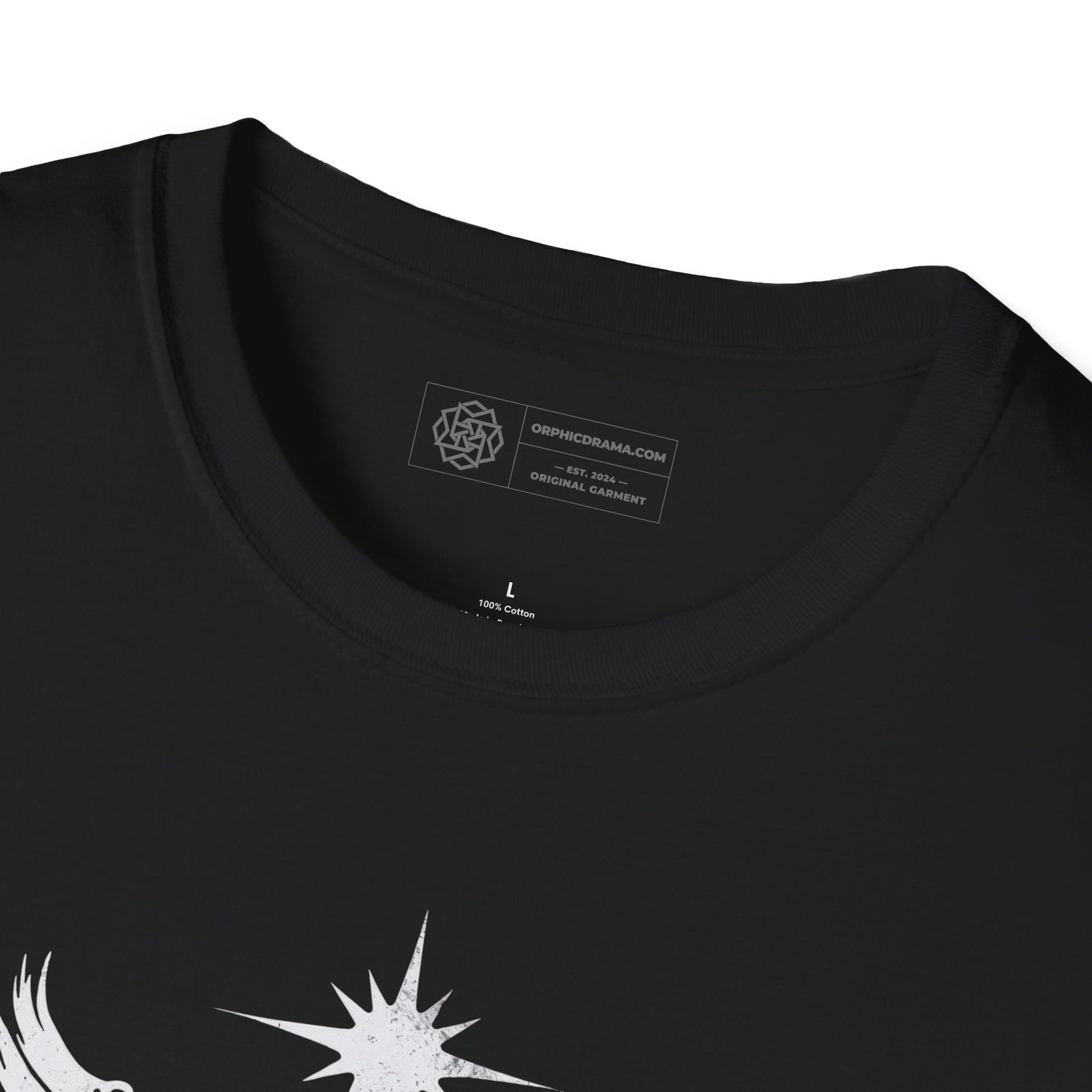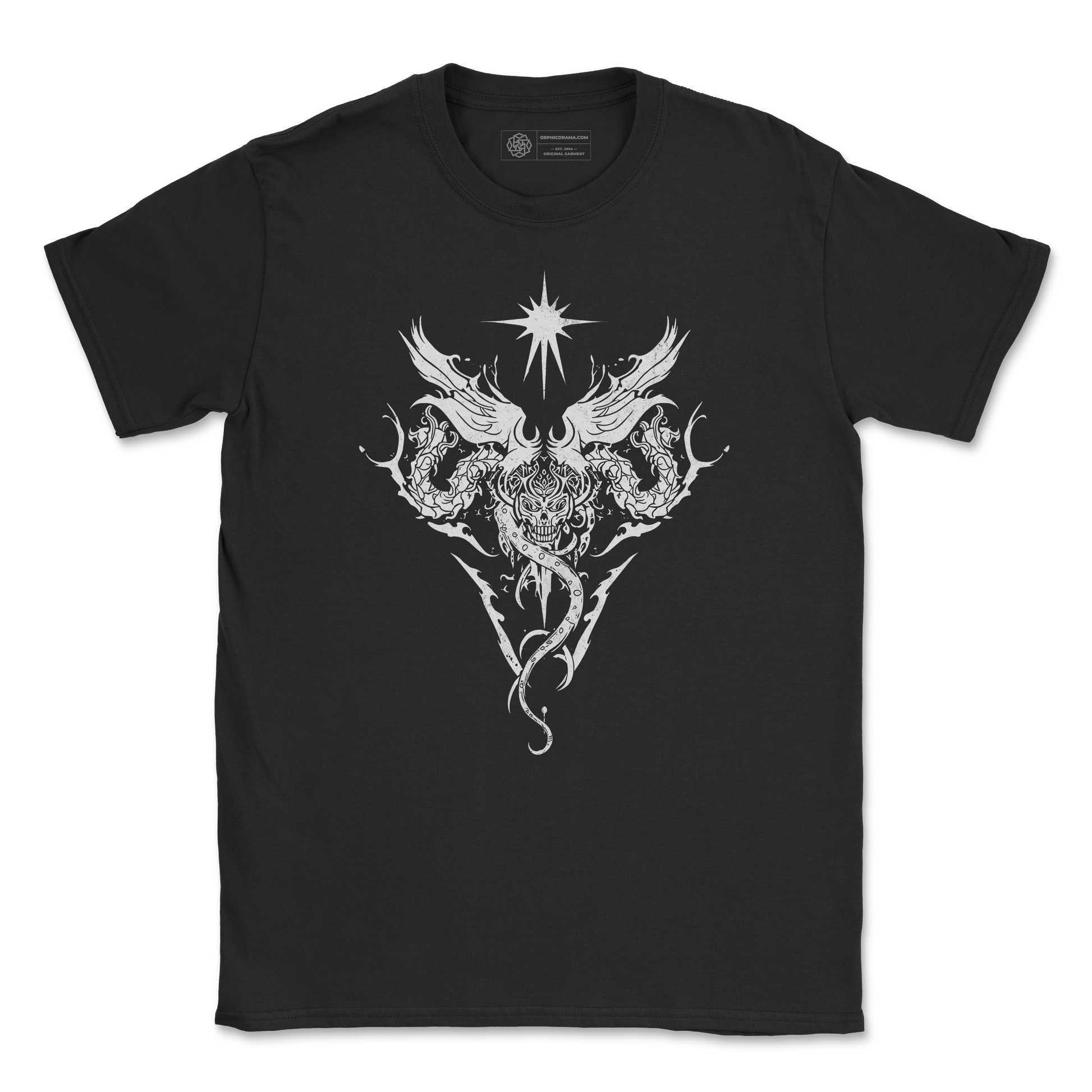 This gothic mythic t-shirt works well for fans of dark symbolism, fantasy imagery, and high-contrast graphic designs that read clearly and feel deliberate.