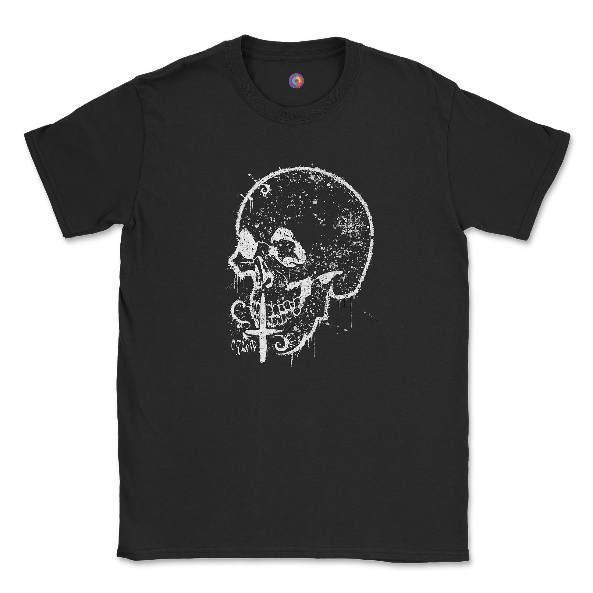 Our Eroded Skull T-Shirt delivers a cracked grunge bone art design built from splatter textures, fractured linework, and a distressed profile silhouette. The worn paint effect creates a raw underground aesthetic, making this a striking addition to any dark wardrobe.