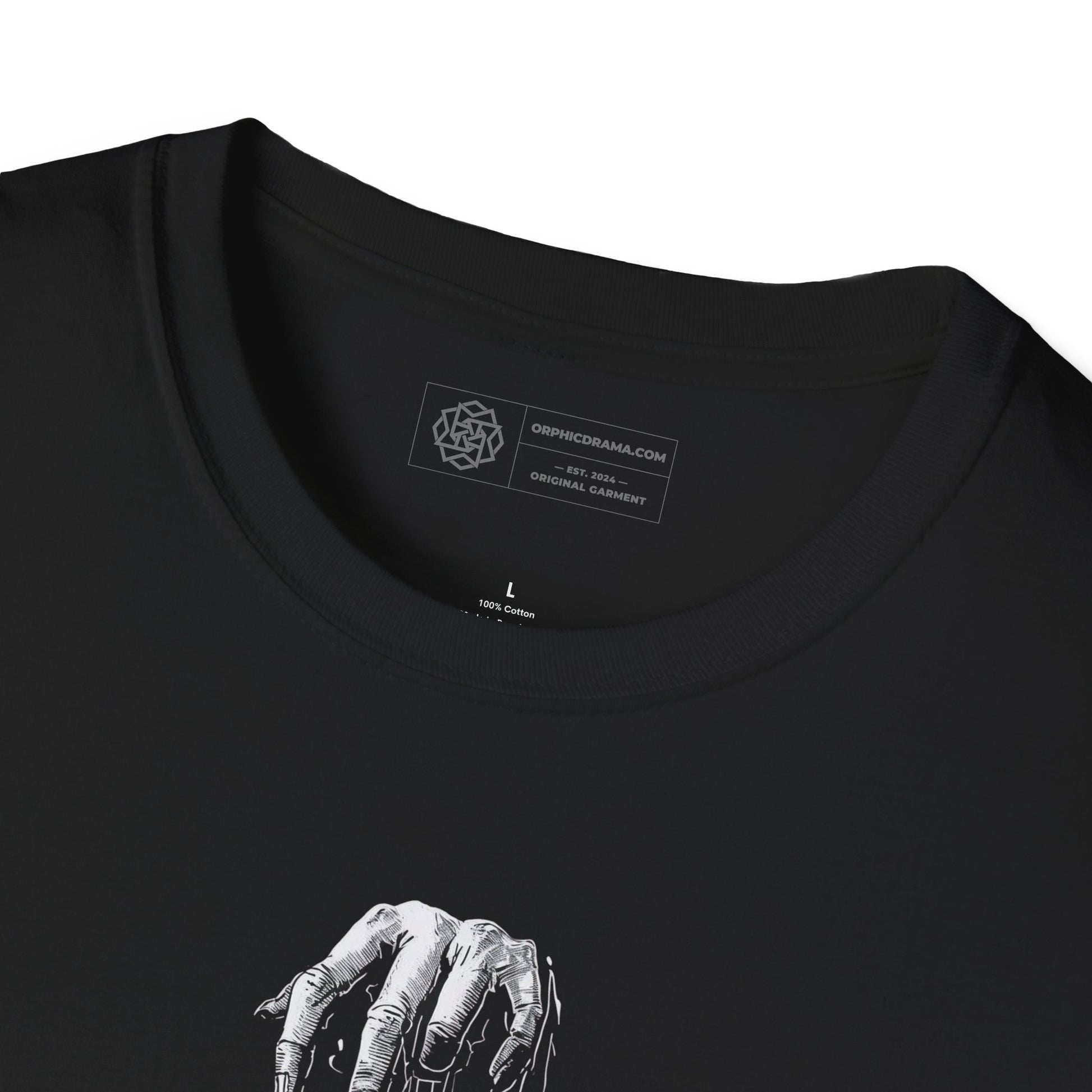 Our Evil Puppet t-shirt showcases a chilling marionette design suspended by a looming skeletal hand, creating a tense and sinister atmosphere. The puppet hangs above a mound of skulls and bones, armed with weapons and surrounded by trailing strings that enhance the unsettling mood. This piece incorporates grindhouse-style gore with a surreal twist.