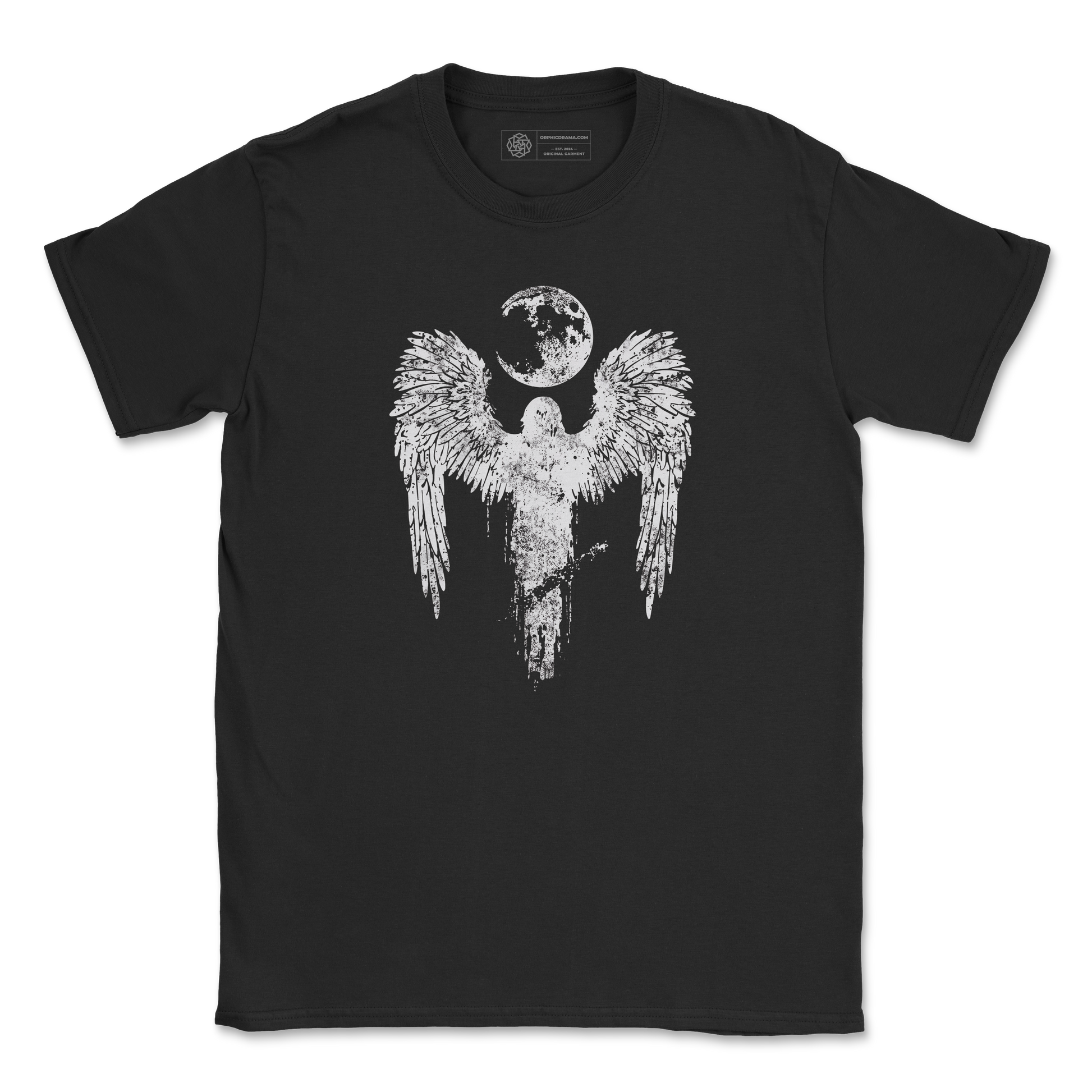 This fallen angel graphic t-shirt leans into dark imagery, moon symbolism, and a minimal gothic aesthetic, keeping the design simple and visually focused.
