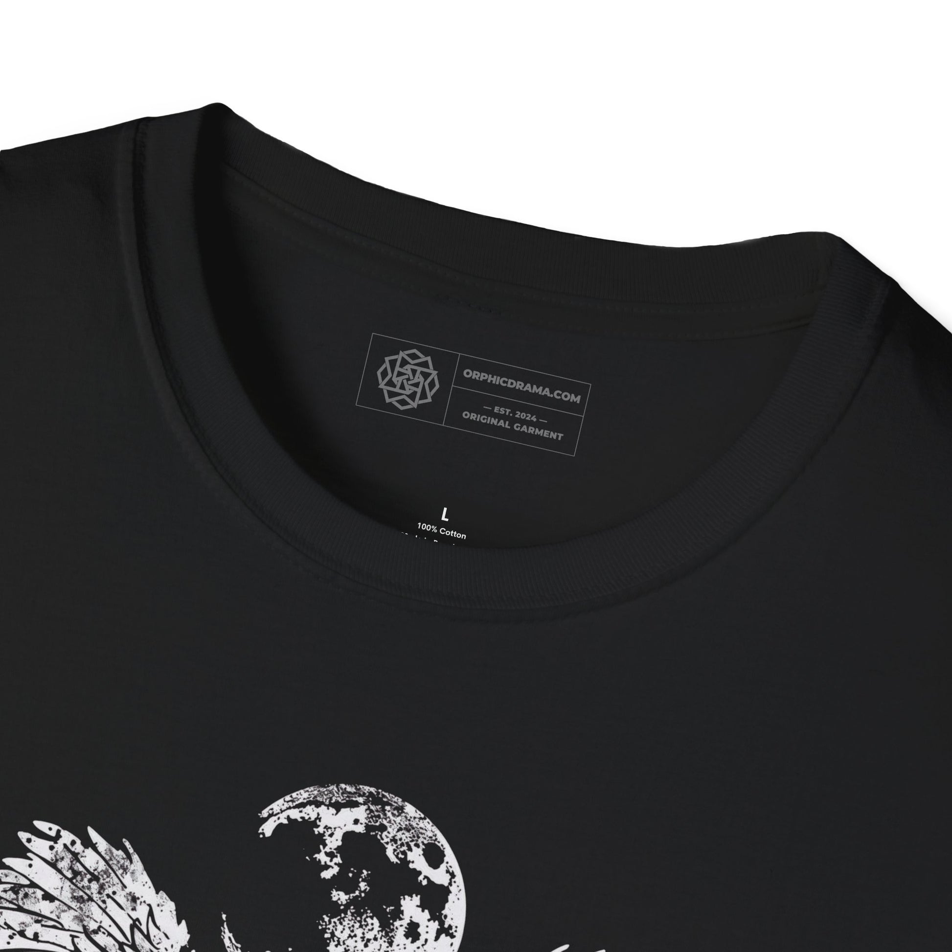Our Fallen Angel Moon T-Shirt features a winged figure beneath a full moon, illustrated in a distressed black-and-white style. The design uses rough linework and worn texture to give the graphic a weathered, dark look.
