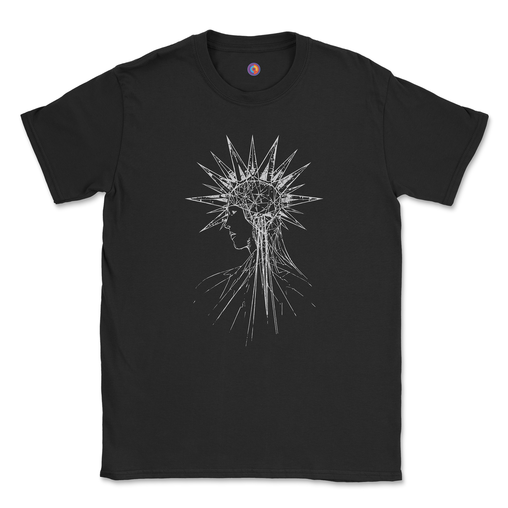 Our Geometric Halo T-Shirt features a minimalist line art face design surrounded by a fragmented geometric halo. Clean linear shapes and broken circular forms give the artwork a striking, modern feel that fits seamlessly into dark aesthetic and alternative streetwear.