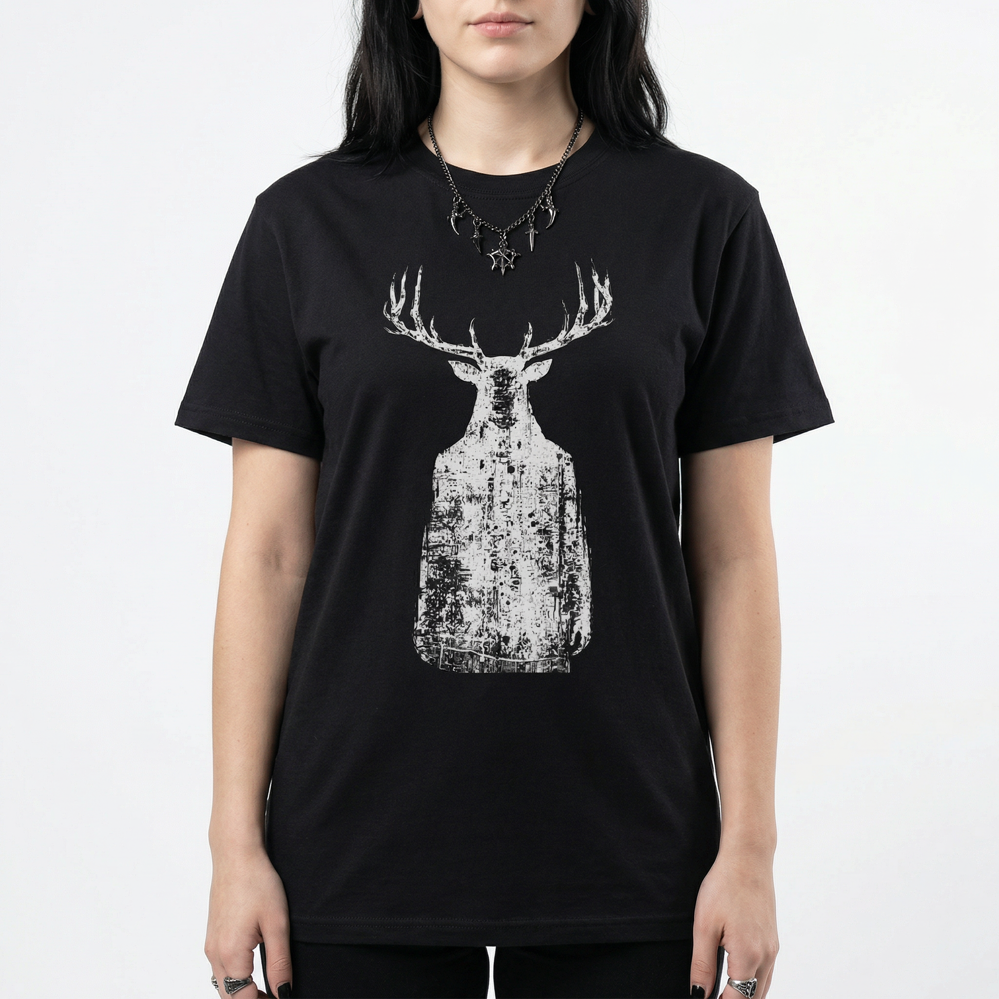 Our Ghost Deer t-shirt captures the eerie presence of a horned figure caught between human and animal form. The distressed textures and stark contrast give it a raw, haunting look that feels straight out of a dark folktale.
