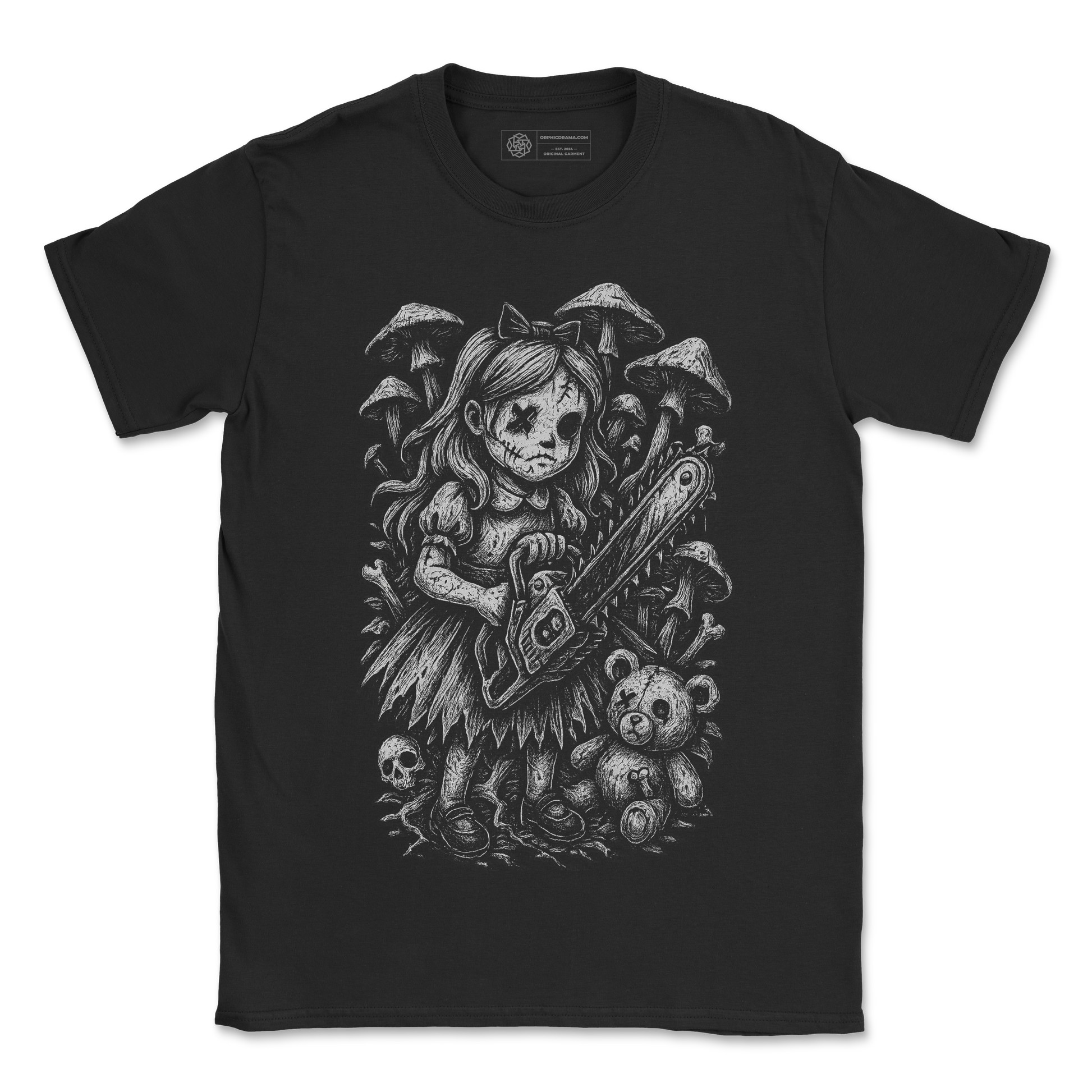 Our Creepy Chainsaw Doll Horror T-Shirt delivers twisted storybook energy with a side of mayhem. The design features a stitched-up doll-like girl gripping a chainsaw, surrounded by oversized mushrooms, a skull, and a torn teddy bear. The scratched, woodcut-style illustration adds texture and tension, giving the whole scene a grim fairytale vibe.