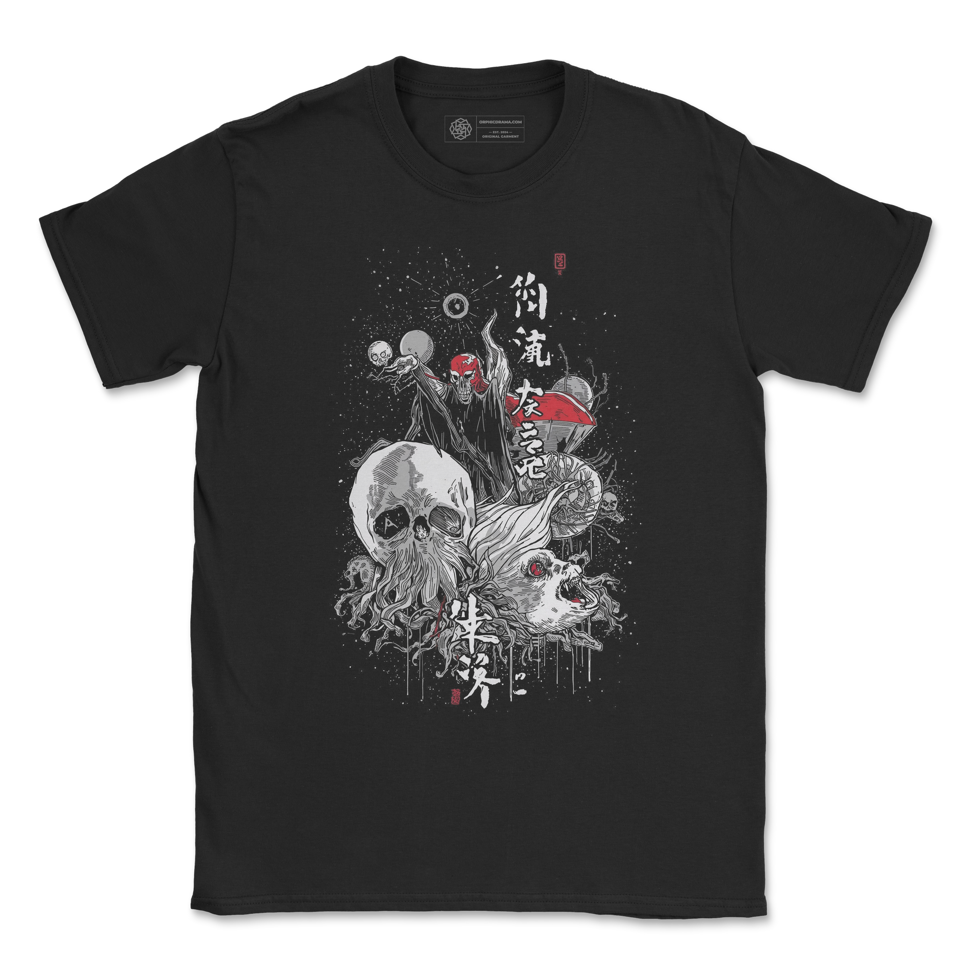 Our Kanji-Inspired Horror T-Shirt delivers a fusion of surreal skull art, grunge textures, and J-horror streetwear energy. This piece showcases a twisted collage of skulls, sinew, and nightmare-fuel linework, accented with stylized kanji-inspired characters and flashes of dark red for a striking visual hit.