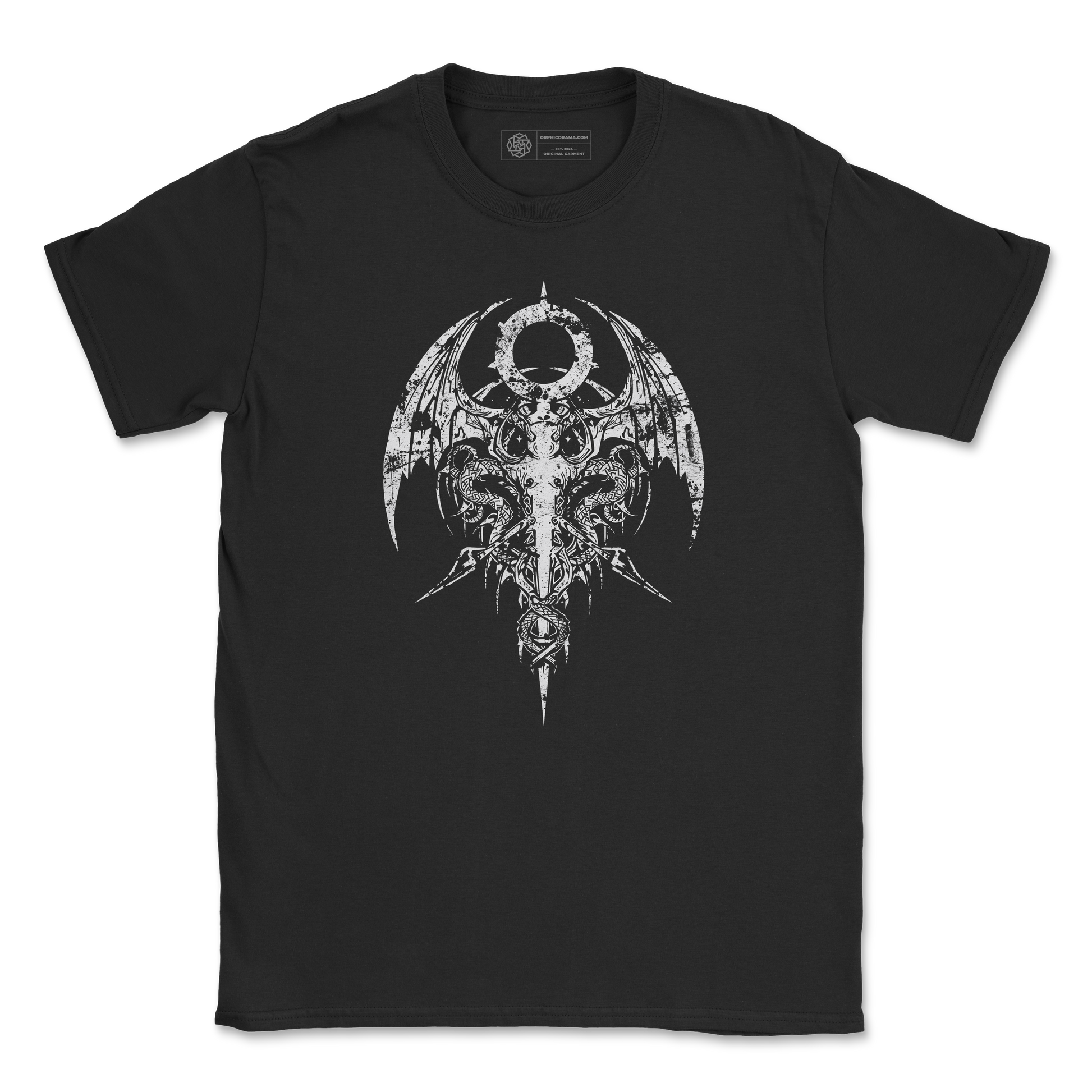 Our Lucifer Sigil T-Shirt features a centered occult sigil design with a winged emblem, circular halo detail, and distressed texture. The symmetrical layout keeps the symbol sharp and easy to read.