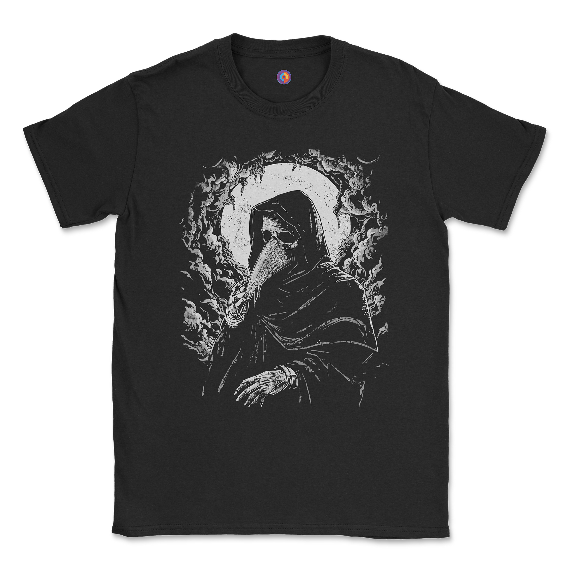 This plague doctor t-shirt features a detailed hand-drawn illustration of the iconic masked figure standing beneath a glowing full moon, framed by jagged swirling clouds. The stark monochrome style gives the artwork a tense, atmospheric presence without relying on gore or shock imagery.
