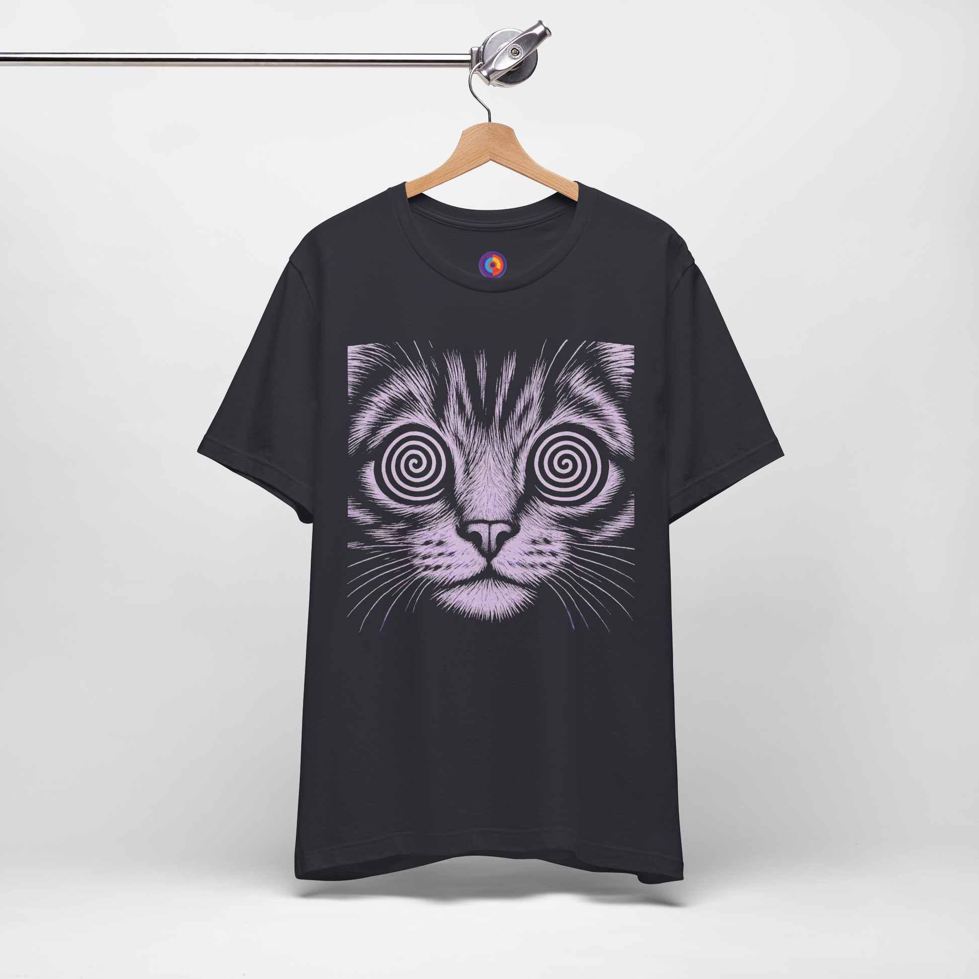 Perfect for fans of trippy cat t-shirts, psychedelic animal designs, or bold graphic tees with hypnotic visuals, this shirt makes a strong visual statement without relying on words.