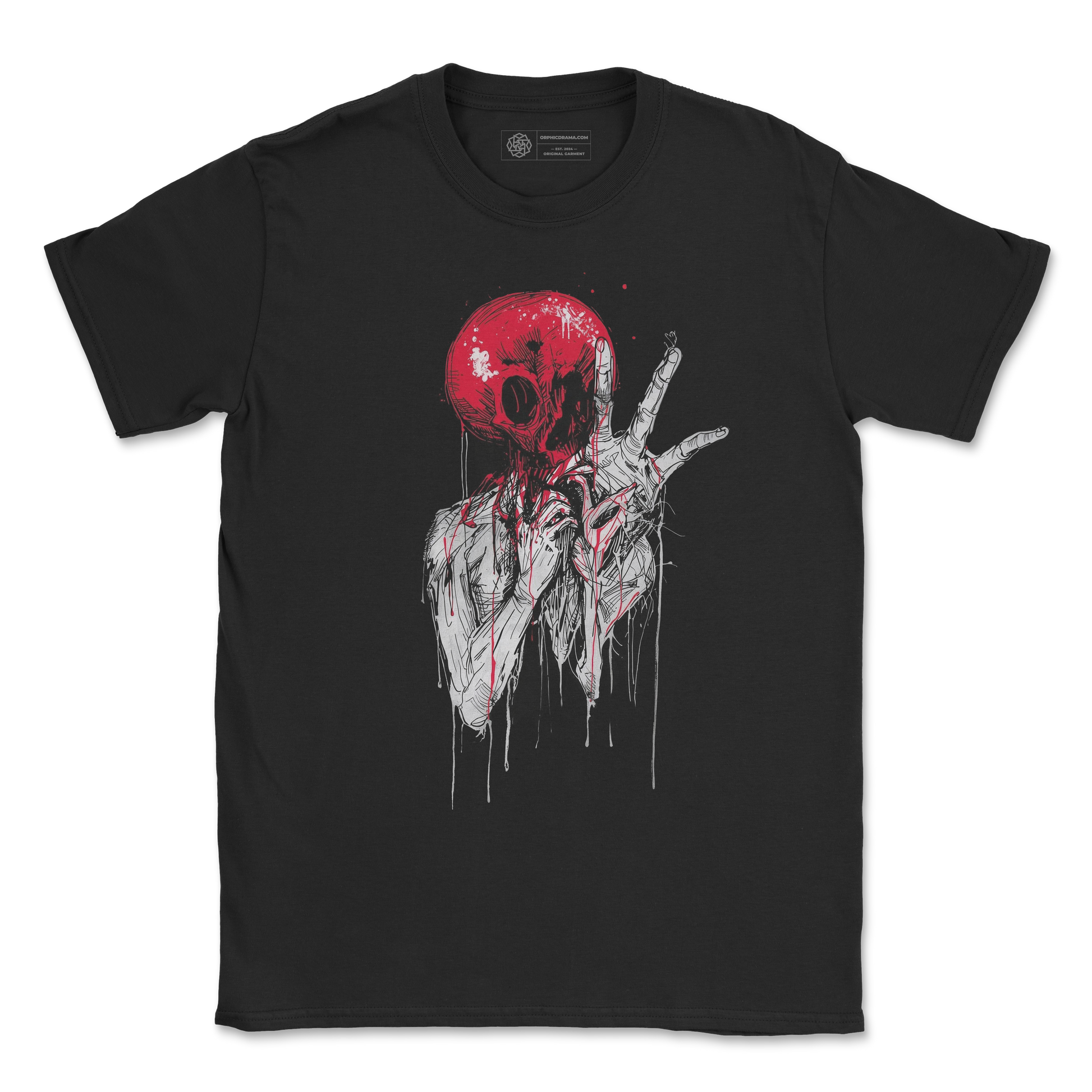 Our Red Horror Skull T-Shirt delivers a wild mix of grunge horror art, distorted linework, and a striking dripping red skull creature. The exaggerated features, sharp ink strokes, and chaotic splatter textures give the artwork a frantic, unsettling energy that hits perfectly in the dark aesthetic space.