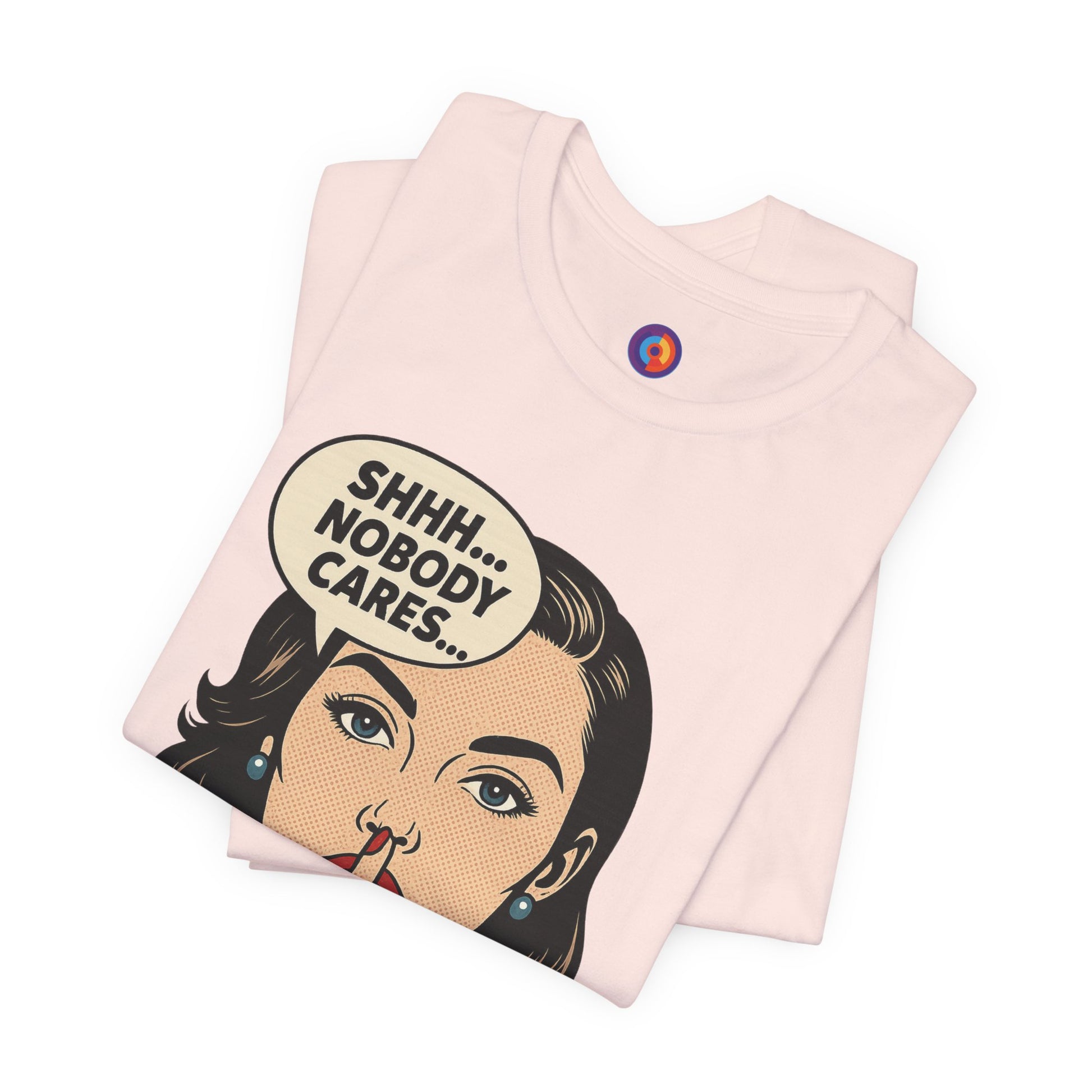 Our Shhh Nobody Cares T-Shirt is a sarcastic classic dressed up in bold pop art style. A perfectly composed comic-style woman puts a finger to her lips, delivering the punchline: "Shhh… Nobody Cares…" in a vintage-style speech bubble.