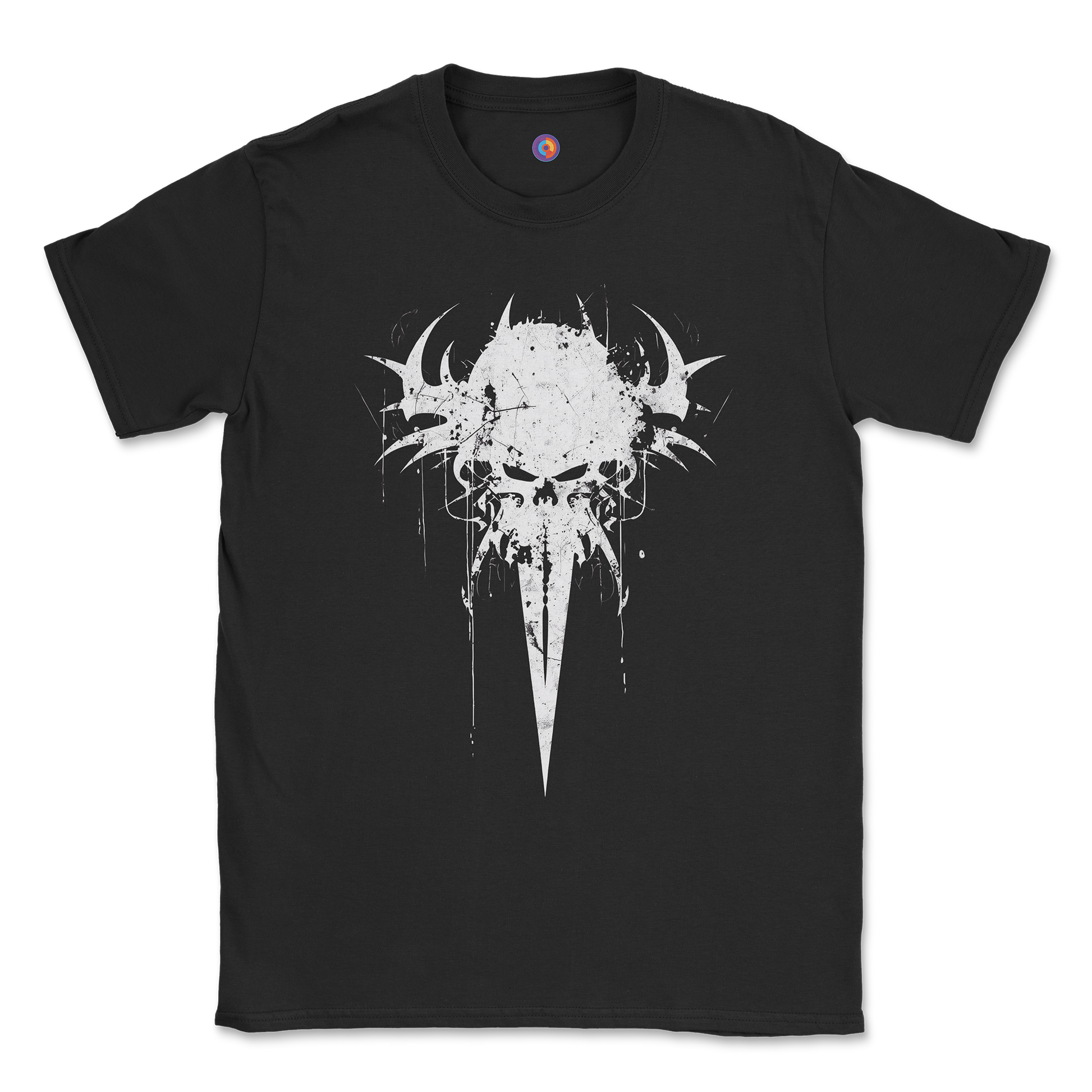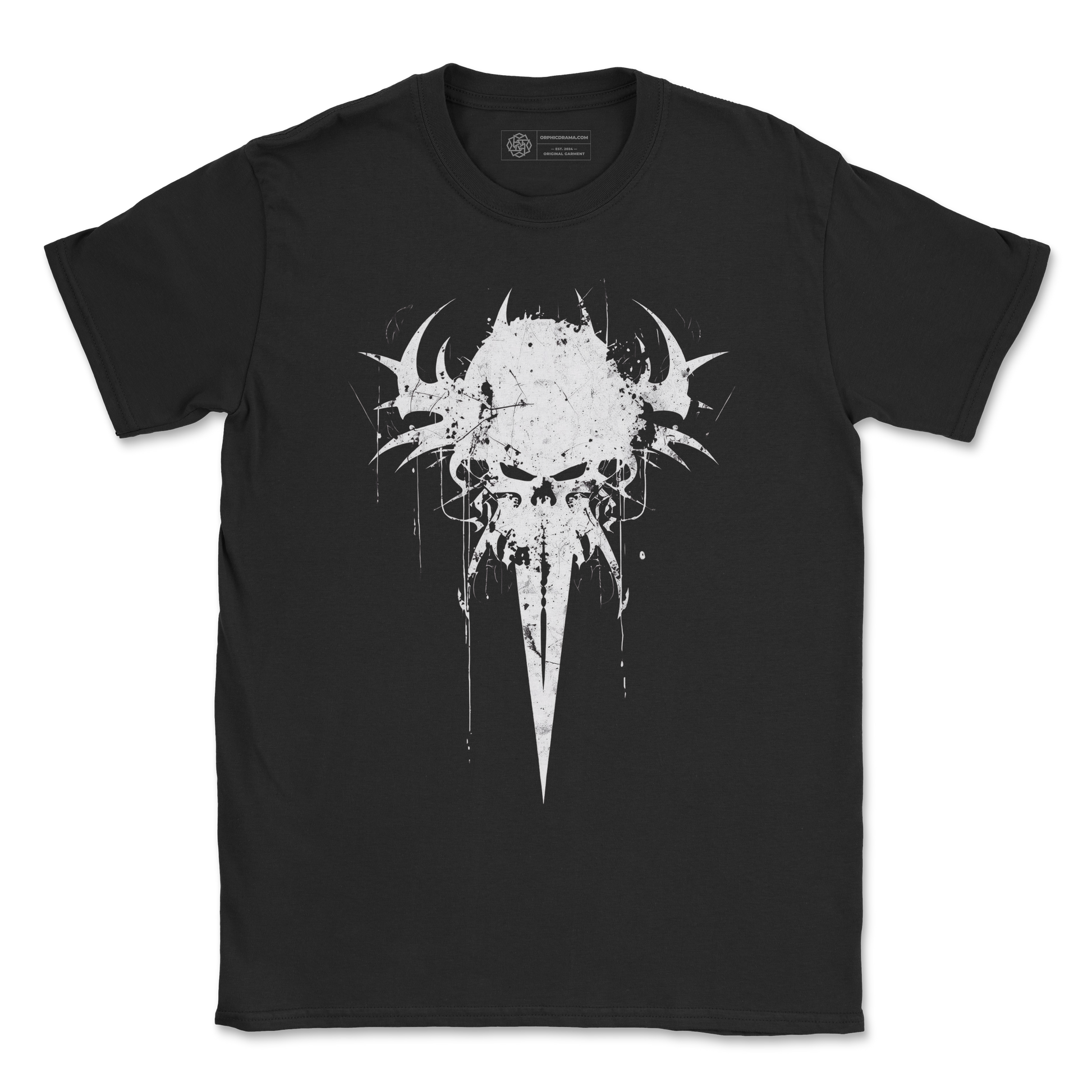 Our Spiked Skull T-Shirt features a minimalist skull graphic with sharp horned points, cracked textures, and a long tapered jaw that cuts like a blade. The design leans heavy into dark grunge, occult metal iconography, and stripped-down blackwork aesthetics.