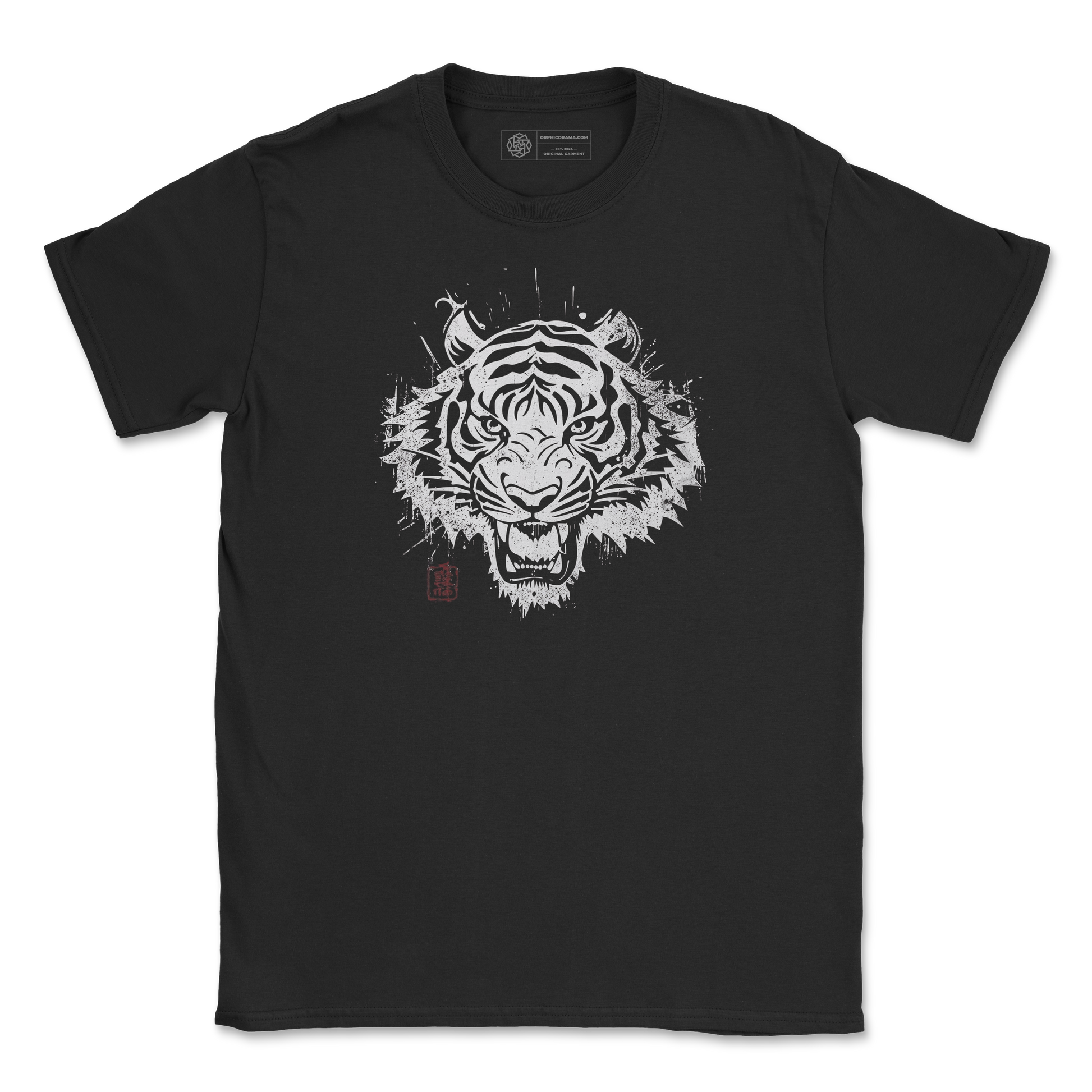 Our Tiger T-Shirt features a striking tiger head graphic rendered in a bold ink-style illustration. The design focuses on the tiger's intense expression, sharp linework, and high-contrast white-on-black presentation.