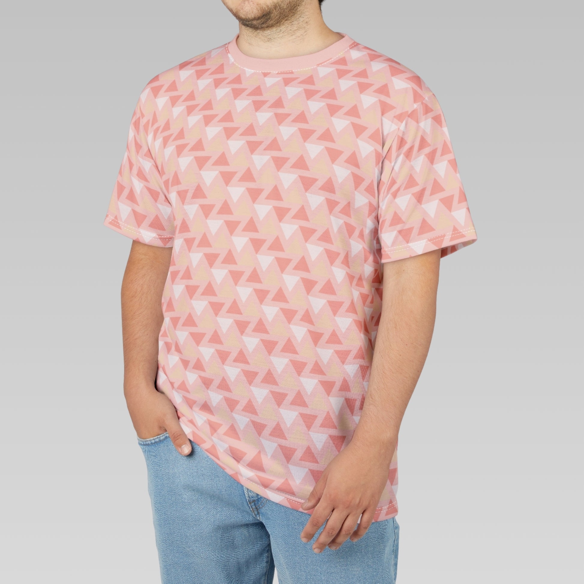 Our Pale Coral Triangle Pattern T-Shirt mixes soft color with structured design. The triangle pattern adds rhythm and balance, while the muted coral base gives it a warm, natural energy that feels grounded but still fresh.