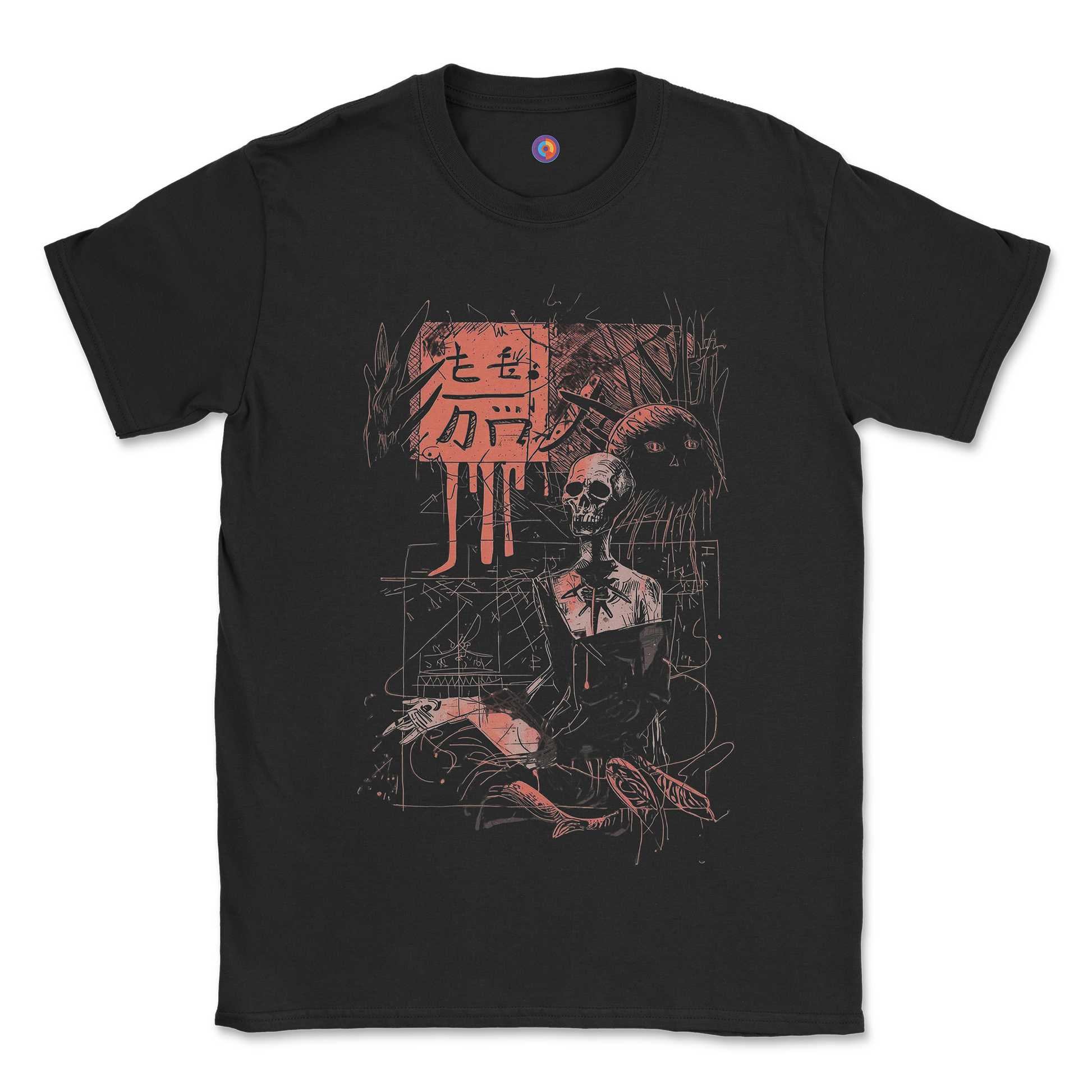 Our Y3K Bone Scribe T-Shirt showcases a surreal hand-drawn skeleton surrounded by chaotic linework and stylized kanji-inspired text in a vivid red accent. The artwork blends dystopian streetwear, abstract horror, and experimental Y3K grunge design into a bold, high-contrast print that stands out on a black tee.